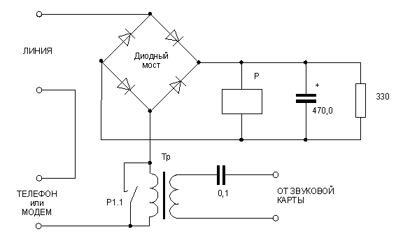 Приведенная простая схема позволяет подключить выход звуковой карты (Sound Blaster) для вывода информации через телефонную линию. Трансформатор - малогабаритный с коэффициентом трансформации 10:1.