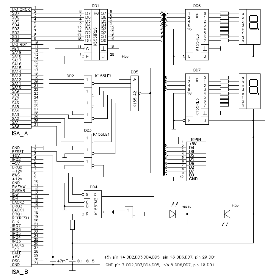 Описание работы схемы достаточно подробно описано в статье Романа Скрипника: "POST Card для шины ISA с семисегментными индикаторами (со схемой)"
