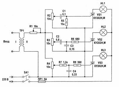 Трансформатор ТР1 выполняется на сердечнике Ш16х24 из трансформаторной стали. Обмотка I содержит 60 витков провода ПЭЛ 0,51. обмотка II — 100 витков ПЭЛ 0,51. Может использоваться и любой другой малогабаритный трансформатор (например, от транзисторных приемников) с соотношением витков в обмотках близким к 1:2. Тиристоры необходимо установить на теплоотводя-щие радиаторы в том случае, если суммарная мощность ламп на один канал будет превышать 200 Вт.
