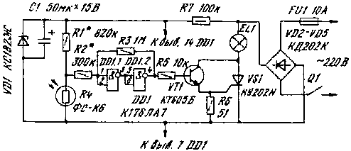 В качестве датчика освещенности можно использовать фоторезисторы ФС-К (с любыми цифрами), а также фотодиоды ФД-1. ФД-2, ФД-3 (подключают катодом к резисторам R1, R2).
