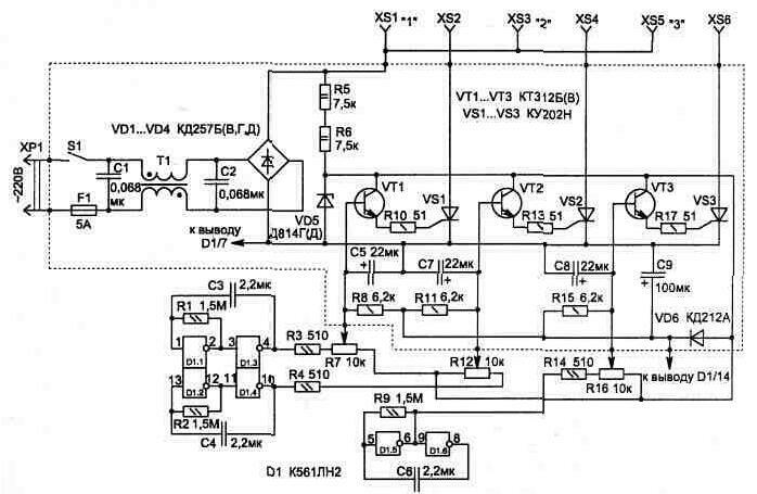Коммутация гирлянд осуществляется тиристорами VS1...VS3. Управляют включением тиристоров транзисторные ключи VT1...VT3, на базу которых поступает сигнал от двух источников - генераторов импульсов на элементах микросхемы D1 и сетевой пульсации, проходящей через переменные резисторы R7, R12, R16.