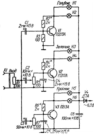 Приставка - трехканальная. Канал на транзисторе V1 усиливает составляющие высших частот, на транзисторе V2 - средних, на транзисторе V3 - низших. Разделение спектра частот входного сигнала осуществляется простейшими фильтрами R3C1, R5C2C4 и R7C3C5. Нагрузками транзисторов служат миниатюрные лампы накаливания МН6,3-0,28, окрашенные в голубой, зеленый и красный цвета.
