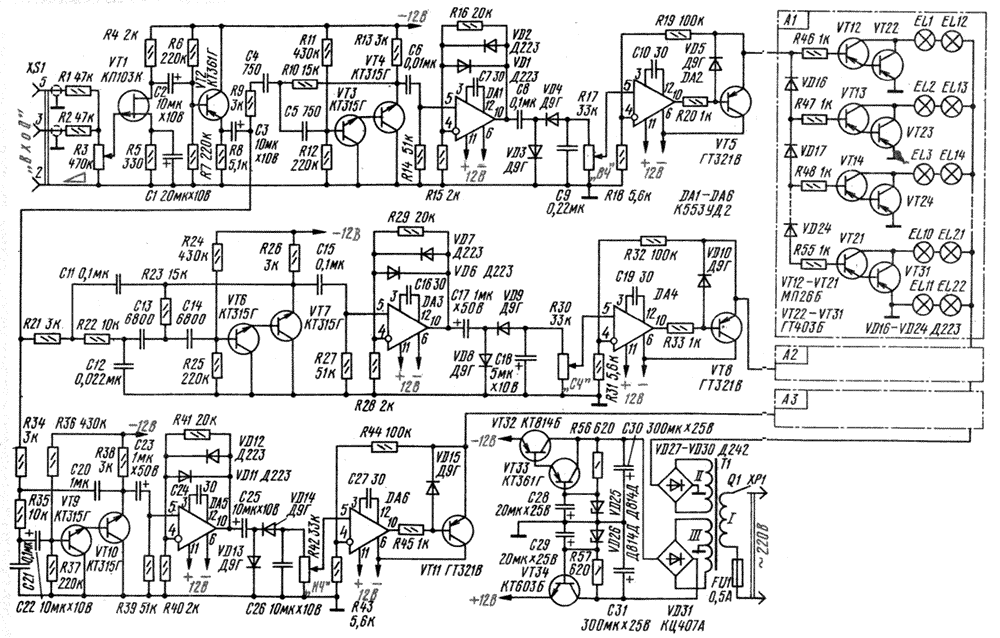В ней предварительный усилитель 3Ч и три активных фильтра: низших (НЧ), средних (СЧ) и высших (ВЧ) частот. После каждого фильтра следует так называемый компрессор, «сжимающий» динамический диапазон воспроизводимого звукового сигнала, а после него -усилитель напряжения, управляющий работой осветительных ламп экрана. Предварительный усилитель, рассчитанный на работу от сигнала, снимаемого с линейного выхода моно- или стереофонического магнитофона либо электрофона, собран на транзисторах VT1 и VT2. Входной сигнал поступает через разъем XS 1 и резисторы Rl, R2 (они позволяют смешивать сигналы левого и правого каналов, поступающие со стереофонического звуковоспроизводящего устройства) на общий регулятор чувствительности — переменный резистор R3. Для увеличения входного сопротивления приставки первый каскад усилителя выполнен на полевом транзисторе VT1 по схеме с общим истоком. Резистором R5 задается нужный рабочий режим транзистора. Конденсатор С1 шунтирует этот резистор по переменному току, чтобы коэффициент усиления каскада по напряжению не снизился. Далее сигнал подается через разделительный конденсатор С2 на вход эмиттерного повторителя, собранного на транзисторе VT2. Он обладает сравнительно большим входным сопротивлением и низким выходным, что необходимо для лучшего согласования входного каскада с каналами разделения сигналов по частоте. Режим работы каскада задается резисторами R6—R8. С резистора R8 усиленный по току и напряжению сигнал поступает через разделительный конденсатор СЗ на входы активных фильтров, выполненных на составных транзисторах VT3VT4, VT6VT7 и VT9VT10. Как известно, составной транзистор обладает высоким коэффициентом передачи (примерно равным произведению коэффициентов передачи обоих транзисторов), а значит, большим входным сопротивлением. Это обстоятельство позволяет получить достаточно крутой спад усиления фильтров вне полосы пропускания. На составном транзисторе VT3VT4 собран фильтр ВЧ, который пропускает сигналы частотой более 2000 Гц. Частота среза задается номиналами цепочки C4C5R10. Фильтр СЧ на транзисторе VT6VT7 пропускает сигналы частотой 200...2000 Гц. Нижнюю частоту среза определяют конденсаторы С 13, С 14 и резистор R23, а верхнюю — конденсаторы С 11, С 12 и резисторы R21, R22. Фильтр НЧ выполнен на транзисторе VT9VT10, он пропускает сигналы частотой до 200 Гц. Частоту среза задают конденсаторы С20, С21 и резисторы R34, R35. Для согласования динамического диапазона сигнала 3Ч (около 40 дБ) с диапазоном изменения яркости ламп освещения экрана (примерно 20 дБ) после каждого активного фильтра стоит компрессор. Он представляет собой усилитель напряжения (на операционных усилителях DA1, DA3, DA5) с логарифмической характеристикой, определяемой нелинейностью вольт-амперных характеристик двух диодов (VD1, VD2; VD6, VD7; VD11, VD12), включенных встречнопараллельно в цепи обратной связи. Максимальный коэффициент передачи компрессора, скажем, на микросхеме DA1, определяется отношением сопротивлений резисторов R16 и R15 — оно соответствует сжатию динамического диапазона сигнала 3Ч приблизительно на 20 дБ (10 раз) при изменении сигнала на входе компрессора от 5 до 500 мВ (100 раз). Сигналы с выходов компрессоров поступают через разделительные конденсаторы (С8, С 17, С25) на выпрямители, собранные на диодах (VD3, VD4; VD8, VD9; VD13, VD14) по схеме удвоения напряжения. Конденсаторы С9, 