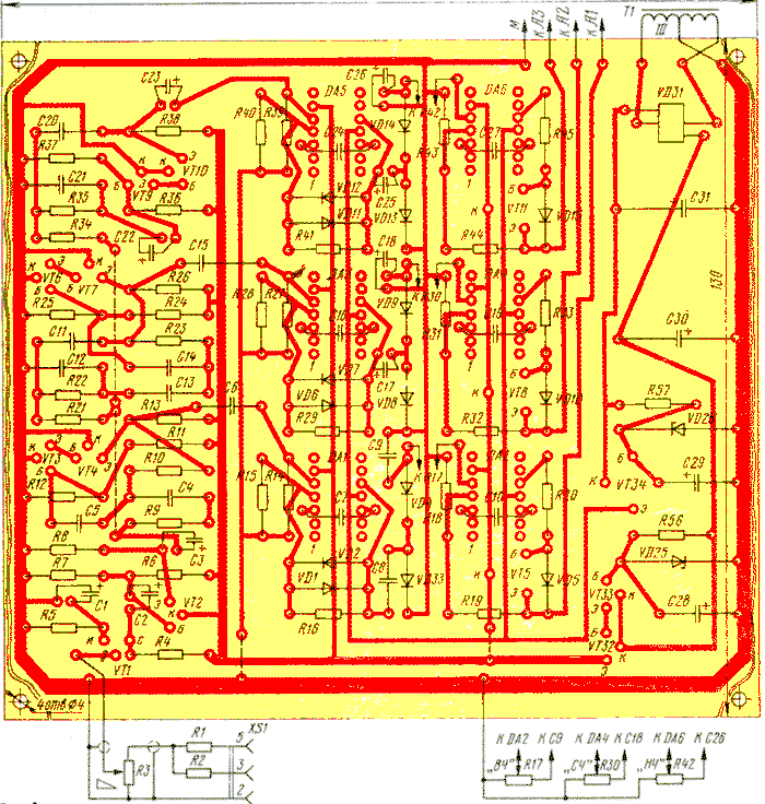 Часть деталей узлов А1—A3 смонтирована на трех отдельных платах (рис. 2) из одностороннего фольгированного материала, а большая часть деталей усилителей, активных фильтров и блока питания размещена на общей плате (рис. 3)из такого же материала.
