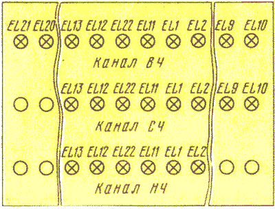 На расстоянии примерно 20 мм от лицевой панели-экрана расположена панель из стеклотекстолита, в которой закреплены лампы накаливания — они расположены в соответствии с рис. 5.