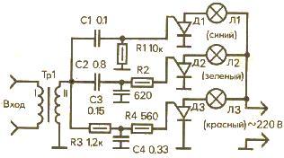 Сигнал звуковой частоты через повышающий трансформатор Tpl подается на вход электрических фильтров. Фильтров столько, сколько каналов цветового сопровождения. В нашем случае три канала, поэтому в приставке три фильтра: первый (высокочастотный) фильтр состоит из конденсатора С1 и резистора Rl; второй фильтр (средних частот) — из конденсаторов С2, СЗ и резистора R2; наконец, третий фильтр (низших частот) — из резисторов R3, R4 и конденсатора С4. Сигналы, проходящие через фильтры, поступают на управляющие электроды тринисторов Д1-ДЗ и открывают их. Через открытые тринисторы проходит ток сети, отчего зажигаются разноцветные лампы накаливания Л1-ЛЗ. Свет этих ламп с помощью рефлекторов проецируется на матовый прозрачный экран приставки.