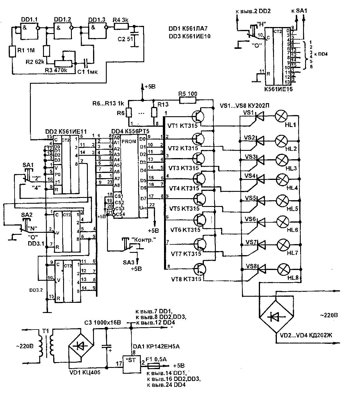 В данном автомате путем использования входа 1 DD2 (К561ИЕ11) удалось получить более 100 световых программ при четырех ИМС.