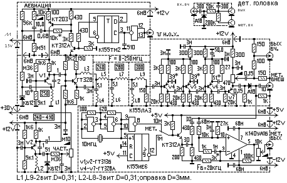 Подбором резистора в блоке триггера установить минимальную амплитудную модуляцию, при максимальной девиации. Частоты настроек контуров ФВЧ изображены в прямоугольниках. Полоса пропускания ФВЧ 0 - 250Мгц , при минимальной нелинейности её АЧХ. Усилитель ВЧ сигнала настраивается элементами со звёздочкой по наибольшей равномерности АЧХ в диапазоне 0 - 250Мгц. В формирователе, подбором резистора, устанавливается требуемый размах "пилы".