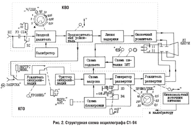 В связи с этим данная статья предназначена для специалистов, у которых возникла необходимость ремонта и настройки осциллографа С1-94. Осциллограф имеет обычную для приборов подобного класса структурную схему (рис. 2). Она содержит канал вертикального отклонения (КВО), канал горизонтального отклонения (КТО), калибратор, электронно-лучевой индикатор с высоковольтным источником питания и низковольтный источник питания.