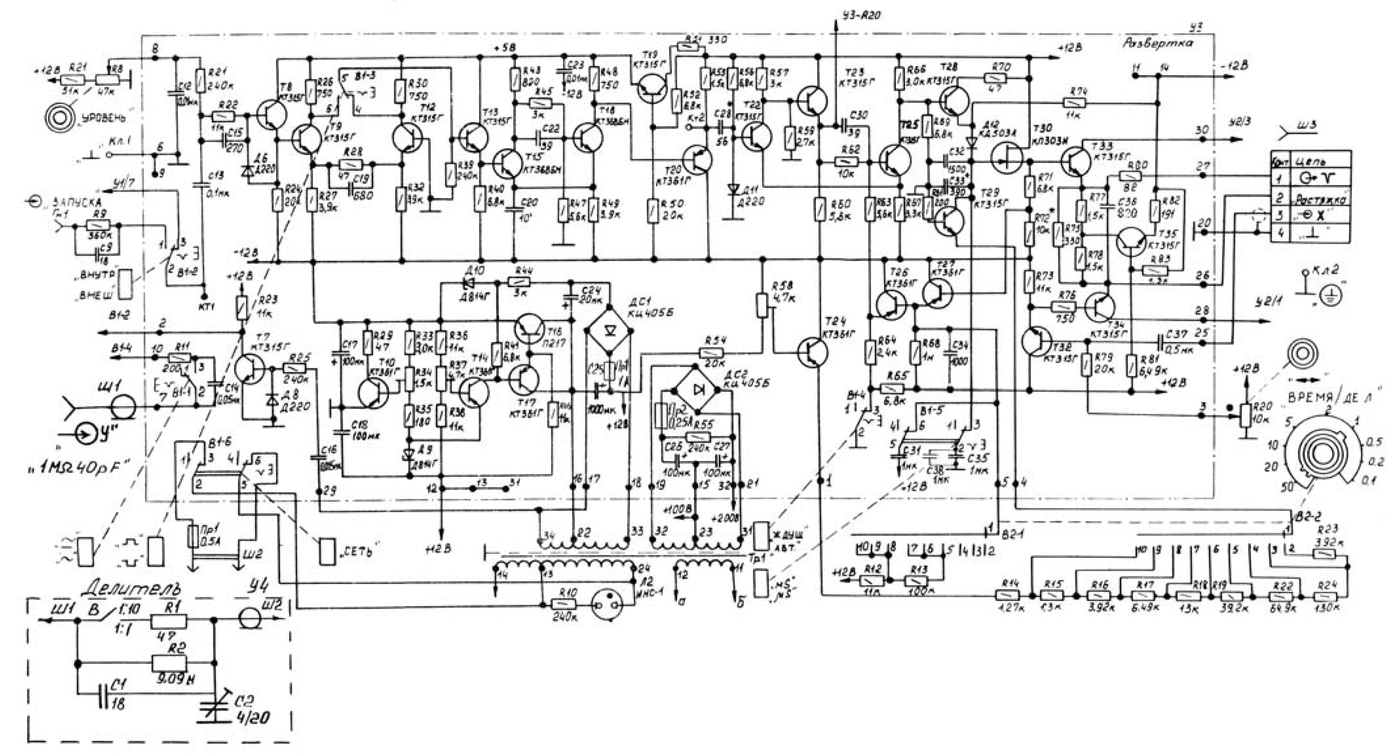 В качестве генератора развертки выбрана схема разряда времязадающего конденсатора через стабилизатор тока. Амплитуда линейно изменяющегося пилообразного напряжения, формируемого генератором развертки, равна примерно 7 В. Времязадающий конденсатор С32-УЗ во время восстановления быстро заряжается через транзистор Т28-УЗ и диод Д12-УЗ. Во время рабочего хода диод Д12-УЗ запирается управляющим напряжением схемы запуска, отключая цепь времязадающего конденсатора от схемы запуска. Разряд конденсатора происходит через транзистор Т29-УЗ, включенный по схеме стабилизатора тока. Скорость разряда времязадающего конденсатора (а, следовательно, и значение коэффициента развертки) определяется величиной тока транзистора Т29-УЗ и изменяется при переключении времязадающих сопротивлений R12...R19, R22...R24 в цепи эмиттера с помощью переключателей В2-1 и В2-2 («ВРЕМЯ/ДЕЛ.»). Диапазон скоростей развертки имеет 18 фиксированных значений. Изменение коэффициента развертки в 1000 раз обеспечивается переключением времязадающих конденсаторов С32-УЗ, С35-УЗ переключателем В1-5 («mS/mS»).