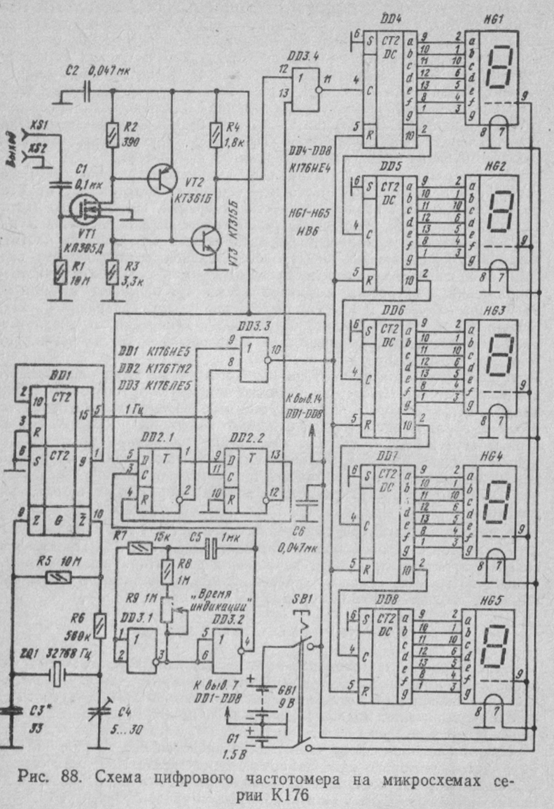 Этот вариант частотомера — пятиразрядный, что позволяет без какой-либо дополнительной коммутации измерять частоту электрических колебаний от нескольких десятков до У9 У99 1ц (100 кГц). Амплитуда сигнала, подаваемого на вход прибора, должна Оыть не менее 0,5 В и не более 30 В.