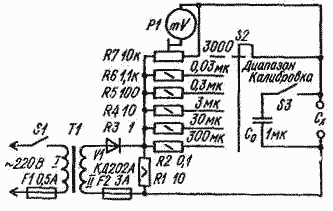 Переменный ток получают однополупериодным выпрямлением пониженного сетевого напряжения. Трансформатор Т1 - сетевой, от любого лампового вещательного приемника. Он должен иметь накальную обмотку на напряжение 6,3 В и ток не менее 1 А. Мощность рассеяния резистора R1 не менее 5 Вт. Необходимы два предохранителя - один в цепи питания, второй защищает стрелочный прибор в случае замыкания клемм, к которым подключают конденсатор Сх, или при пробое проверяемого конденсатора.