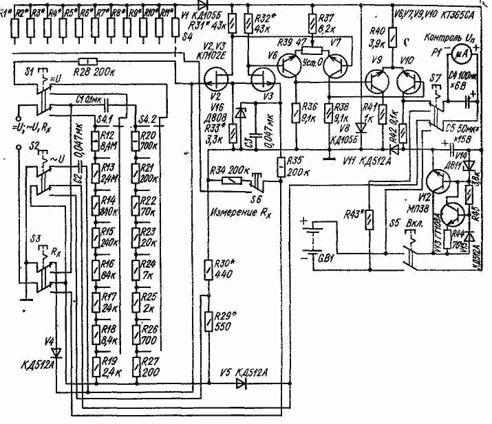 Последовательно с микроамперметром включены резисторы R29*, R30*, на которых выделяется напряжение отрицательной обратной связи, пропорциональное току через микроамперметр. Схема прибора составлена так, что усиливается только положительное напряжение, подаваемое на затвор транзистора V2 (инвертирующий вход дифференциального усилителя) и отрицательное, подаваемое на затвор V3 (неинвертирующий вход). При напряжениях обратной полярности транзистор V10 закрывается и ток обратного отклонения микроамперметра можно получить лишь за счет вспомогательного питания. Поэтому в коллекторную цепь транзистора V9 включен диод VII, и с него снимают напряжение для компенсации падения напряжения на резисторе R42, создаваемого начальным током транзистора. Этот ток выбирают в пределах 0,04...0,05 мА для повышения линейности начального участка характеристики усилителя. Кнопки S1-S3 служа* для выбора вида измерений. Переключателем S4 изменяют пределы измерений. Защита прибора от перегрузок при измерении напряжений осуществляется .резистором R28 и диодом V4, при измерении сопротивлений - резистором R35 и диодом V16. Диоды VI и V8 также служат для защиты транзисторов усилителя от перегрузок.