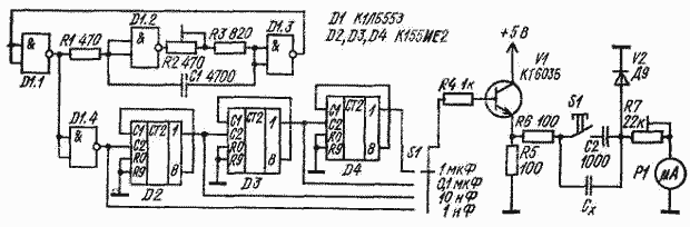 Измеритель емкости состоит из генератора импульсов (D1.1-D1.3), делителя частоты (D2-D4), электронного ключа (V1) и измерительной цепи (V2, R7 и Р1).