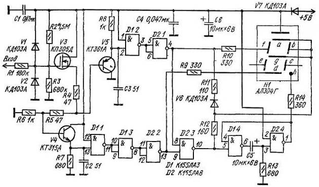Через резистор R1 сигнал поступает на затвор полевого транзистора V3. Ограничителем входного напряжения служат диоды VI, V2, благодаря которым можно подключать пробник к цепям, находящимся под напряжением 250 В. После истокового повторителя сигнал подается на эмиттерные повторители (транзисторы V4 и V5), которые уменьшают взаимное влияние микросхем и сдвигают уровни входных сигналов, что необходимо для четкого срабатывания логических элементов D1.1 и D1.2.
