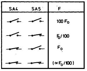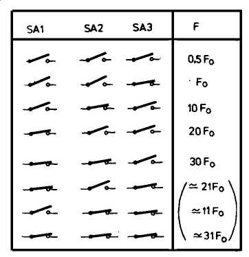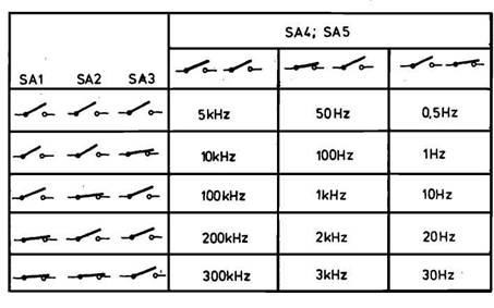 Сердцем генератора является триггер Шмитта DD1.1, который вместе с R1 и С1 образует мультивибратор, построенный по классической схеме. Различие частот, вырабатываемых мультивибратором, определяется соответствующим количеством подсоединяемых к нему конденсаторов, резисторов и переключателей. Сигналы в точках VI ≈ V5 можно изменять, используя разное сочетание разрывов или соединений в цепях схемы с помощью переключателей SA1≈ SA5. В таблицах наглядно отражена зависимость частоты на выходе устройства от положения этих переключателей.