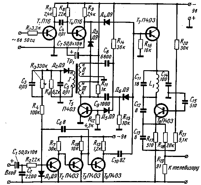 Для повышения четкости изображения линии на экране телевизора усилитель (T2, Т3, T6) охвачен положительной обратной связью с коллектора транзистора Т3 на базу транзистора Т2 через конденсатор С6. Это значительно повышает усиление в области высоких частот и, следовательно, увеличивает крутизну фронта выходных импульсов. Визуально это проявляется в повышенной резкости перехода от белого к черному.