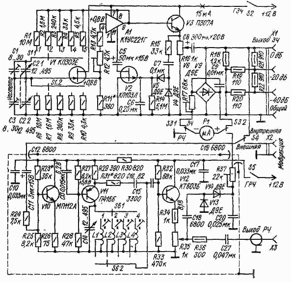 Генератор РЧ выполнен на транзисторах VII-V12. Диапазон генерируемых частот изменяют, переключая катушки индуктивности L1-L4 - ступенчато и плавно внутри каждого поддиапазона - конденсатором С14.