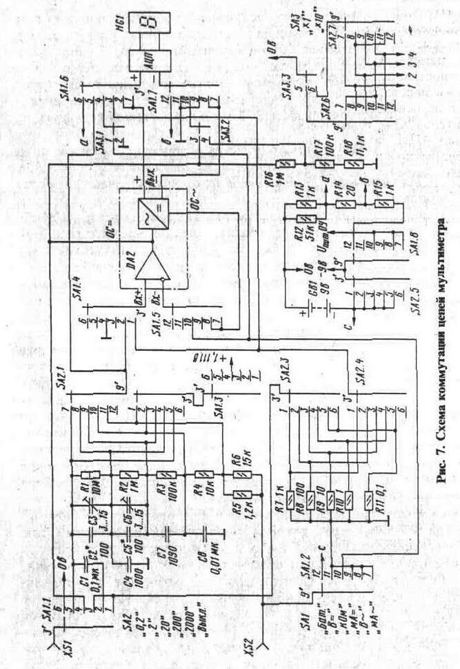 Теперь можно приступать к сборке первой платы. Рекомендуемый порядок проведения объемного монтажа цепей коммутации такой. Вначале переключатели SA1 и SA2 устанавливают на кронштейн и соединяют между собой их контакты в соответствии со схемой рис. 7. К контактам переключателей подпаять проводники МГТФ-0,14 с некоторым запасом по длине для соединения с печатными платами мультиметра и с переключателем SА3. Затем, установив кронштейн на плату, впаять проводники, идущие от переключателей, в соответствующие отверстия плат и подпаять переключатель SA3, установив его па плату. Провод от переключателя SA1.2 к скобе, соединяющей резисторы R7 - R 11, должен быть проложен отдельно от других цепей и подключен к концу скобы у резисторов R11. Шунты R9 - R11 подключают к секциям переключателя SA2.3 и SA2.4 двумя проводниками, каждый проводник к своей секции. У R10 и R11 для этого предусмотрено по два контакта. Поскольку почти все добавочные резисторы вольтметра и шунты миллиамперметра устанавливают перпендикулярно печатной плате, в большинстве случаев при отсутствии необходимого номинала их можно составлять из двух последовательно или параллельно включенных резисторов.