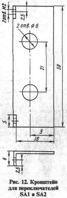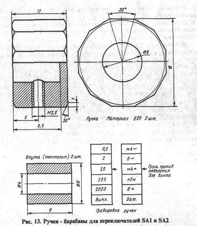 Переключатели SA1 и SA2 размещены на кронштейне из латуни толщиной 1 мм (рис. 12), который установлен в вырезе первой платы. Входные гнезда XS1 и XS2 для штырей диаметром 1,6 мм находятся на боковой стенке корпуса. Переключатели снабжены ручками - барабанами с гравировкой режимов и пределов измерений (рис. 13). Следует помнить, что ручки должны быть изолированы от осей переключателей. Переключатель SA3 закреплен на уголке из латуни той же толщины, его ось параллельна длинной стороне платы. Управляется переключатель рычагом, изготовленным из органического стекла толщиной 4,5 мм. Ось переключателя укорочена до 4,5 мм, лыска оси расширена до стопорной шайбы.