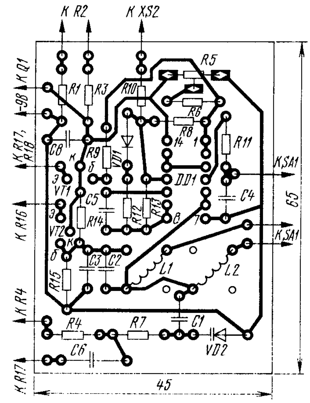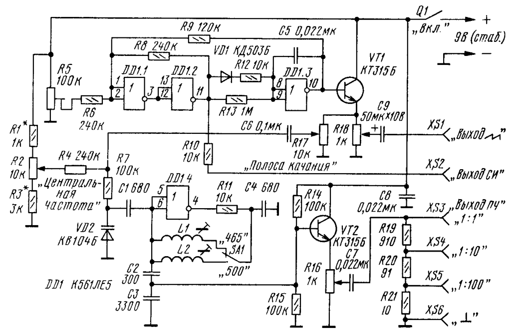 Генератор ПЧ собран на элементе DD1.4. В его цепь обратной связи включен контур, образованный катушкой индуктивности, конденсаторами С1 - С4 и варикапом VD2. На варикап подаются два управляющих напряжения, одно из которых постоянное (подано через R1 - R4) и определяет центральную частоту генератора, а второе - пилообразное (подано через R17C6), оно определяет полосу качания. Переключение центральной частоты производят сменой катушки индуктивности L1 и L2 переключателем SA1. Это сделано для того, чтобы упростить настройку прибора и сделать единую шкалу резистора R17. С емкостного делителя С2 и С3 часть напряжения генератора ПЧ подают на буферный каскад на транзисторе VT2, на выходе которого установлены плавный (R16) и ступенчатый регуляторы (R19 - R21) выходного напряжения. В конструкции можно применить детали: микросхемы - К176ЛЕ5, К561ЛА7, К176ЛА7; транзисторы - КТ315, КТ312, КТ3102 с любыми буквенными индексами; диод VD1 -КД509, КД521А, КД522Б, Д220, Д223; варикап- KB104A-KB104E, КВ119А; конденсатор С9 - К50-3, К50-6, К53-1, остальные - КЛС, KM, KT; выключатель питания - П2К, МТ1; резисторы R2, R16-R18-СП , СПО, СП4-1, R5 -СП3-3, остальные - ВС, МЛТ. Катушки намотаны на каркасах от катушек ПЧ радиоприемника "Альпинист-407" и содержат 350 (L1) и 310 (L2) витков провода ПЭВ-2 0,08, намотка многослойная. Большинство деталей генератора размещено на печатной плате из фольгированного текстолита. Все переменные резисторы, постоянные R19 - R21, конденсаторы С7 и С9, а также выходные гнезда и выключатель Q1 размешены на передней панели. Налаживание устройства сводится к градуировке шкал резисторов R2 и R17 и установке требуемой формы пилообразного напряжения. Для этого сначала подключают осциллограф (Rвх=1 МОм) к выходу элемента DD1.3 и резистором R5 добиваются неискаженной формы "пилы". Изменение ее амплитуды выполняют подбором сопротивления резистора R9. Частоту "пилы" можно изменить подбором емкости конденсатора С5. Затем к выходу генератора ПЧ подключают частотомер, резистор R2 устанавливают в среднее положение, а R17 - в нижнее (по схеме). Магнитопроводом катушки L1 устанавливают частоту 465 кГц, а L2 - 500 кГц, потом градуируют шкалу резистора R2 на обоих поддиапазонах и в случае необходимости подбором резисторов R1 и R3 добиваются требуемого диапазона перестройки и его симметричности относительно центральных частот. Затем градуируют шкалу резистора R17. Для этого на вход Х осциллографа подают напряжение синхронизации с гнезда XS1 генератора ПЧ, а на вход Y осциллографа - сигнал с гнезда XS4 ("Выход ПЧ" 1:10) генератора ПЧ и через резистор 100 Ом с образцового генератора высокой частоты, который используют как эталонный. Резистором R18 устанавливают длину развертки на ширину всего экрана осциллографа. После этого, вращая резистор R17 и изменяя частоту образцового генератора, по нулевым биениям на экране осциллографа градуируют шкалу резистора R17 "Полоса качания" в кГц. Питать генератор ПЧ следует от стабилизированного источника с током не менее 20 мА.
