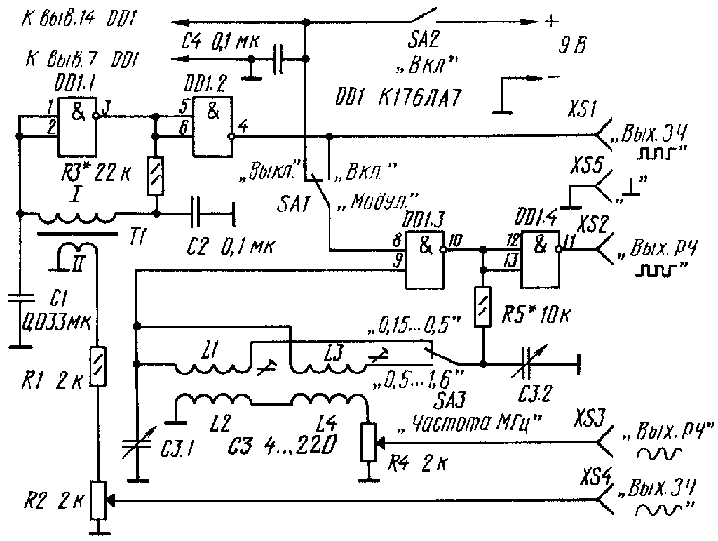 С помощью этого сравнительно простого прибора удастся проверять каскады усилителей ЗЧ и РЧ самодельных и промышленных радиоприёмников, работающих в диапазонах СВ и ДВ. Частотный диапазон генератора лежит в пределах 0,15...1,6 МГц, генерируемые колебания могут быть как синусоидальной, так и прямоугольной формы. Кроме того, генератор выдает сигнал частотой 1 кГц также синусоидальной и прямоугольной формы. При желании колебаниями ЗЧ можно промодулировать сигнал генератора РЧ. Возможность снимать с генератора сигналы ЗЧ и РЧ разной формы, а также амплитудой от нескольких милливольт до нескольких вольт, позволяет пользоваться им, кроме проверки и настройки радиоприемников, для контроля работы и поиска неисправностей в различных устройствах на транзисторах, аналоговых и цифровых микросхемах. Схема генератора приведена на рис.1. В нем всего одна микросхема. На ее логическом элементе DD1.1 выполнен генератор ЗЧ. Колебания образуются благодаря введению между входом и выходом элемента цепи обратной связи из резистора R3 первичной обмотки трансформатора Т1 и конденсаторов C1, C2. В результате элемент выходит на линейный участок так называемой передаточной характеристики и каскад самовозбуждается. Частота генерируемых колебаний зависит от емкости конденсатора C1 и индуктивности обмотки трансформатора. Со вторичной обмотки трансформатора колебания синусоидальной формы поступают на делитель напряжения из резисторов R1 и R2, а с движка резистора R2 (им регулируют амплитуду выходного сигнала) подаются на выходное гнездо XS4. К генератору ЗЧ подключен согласующий каскад на элементе DD1.2, на выходе которого также формируется сигнал ЗЧ, но прямоугольной формы и амплитудой около 9 В. Этот сигнал поступает на выходное гнездо XS1. Генератор колебаний РЧ собран на логическом элементе DD1.3 по такой же схеме, что и генератор ЗЧ. В качестве частотозадающих цепей здесь используются катушка индуктивности L1 (либо L3) и сдвоенный конденсатор переменной емкости С3. Весь диапазон генератора РЧ разбит на два поддиапазона: 0,15...0,5 МГц и 0,5... 1,6 МГц. Тот или иной поддиапазон устанавливают переключателем SA3, а частоту изменяют плавно конденсатором переменной емкости. Амплитуду сигнала синусоидальной формы, снимаемого с катушек L2 и L4 и подаваемого на гнездо XS3, можно изменять переменным резистором R4.