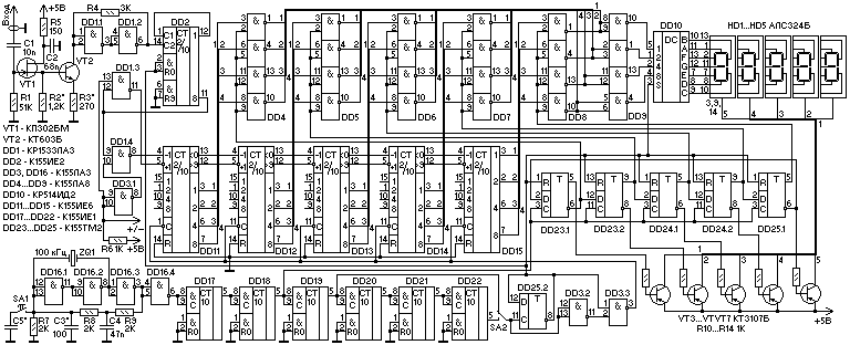 В устройстве использовано пять светодиодных знаковых индикаторов АЛС324Б с общим анодом. Одинаковые сегменты соединены вместе и подключены к выходам дешифратора DD10. Для индикации в каждом знаке любого числа индикаторы работают в динамическом режиме - каждый индикатор поочередно подключается к своему разряду счетчика с одновременным его включением через транзисторные ключи VT3...VT7. Динамический режим работы индикаторов организован следующим образом: на выходах ячеек сдвигового регистра DD23.1...DD25.1 поочередно появляется пять импульсов счетного интервала. Каждый из этих импульсов подается на входы 2, 5, 9, 12 микросхем DD4...DD8 К155ЛА8. Входы этих микросхем соединены с выходами микросхем DD11...DD15, на которых формируются двоичные коды числа килогерц (герц) частоты входного сигнала. Выходы DD4...DD9 объединены в "монтажное или"(это позволяют выходы с "открытым коллектором") и подключены к инвертору, собранному на микросхеме DD9 К155ЛА8. С выходов DD9 двоичное число килогерц (герц) частоты входного сигнала поступает на входы дешифратора DD10 КР514ИД2, превращающего это число в семь напряжений, которые подаются на соответствующие сегменты индикаторов. С пяти выходов счетного регистра импульсы подаются на транзисторные ключи VT3...VT7, которые включают соответствующий индикатор, согласно подключенному к дешифратору счетчику. На вывод 3 DD10 подается импульс счетного интервала, так что напряжения на сегментах индикаторов формируются после окончания счета в DD11...DD15.