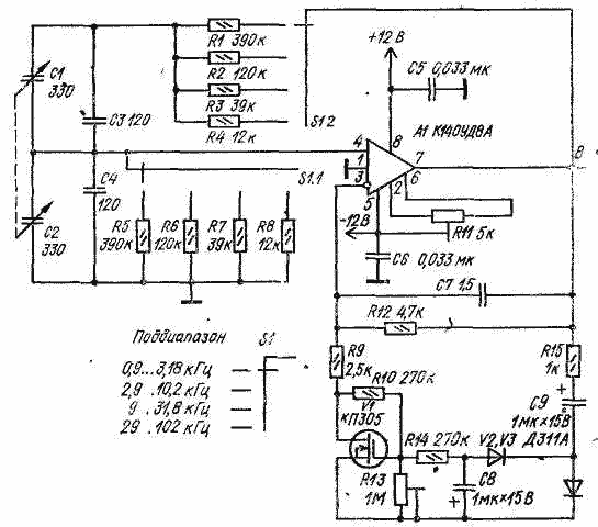 Такой генератор можно собрать, используя ОУ с входной цепью на полевом транзисторе. Фазовращающая цепь подключена к неинвертирующему входу ОУ. Стабилизация амплитуды генерируемых колебаний осуществляется с помощью транзистора VI. Сигнал с выхода ОУ выпрямляется диодами V2, V3 и поступает на затвор полевого транзистора. При изменении амплитуды колебаний сопротивление сток - исток также изменяется, что приводит к изменению коэффициента передачи ОУ. Таким образом, амплитуда колебаний на выходе генератора остается постоянной. Чтобы коэффициент нелинейных искажений генерируемых колебаний не превышал 0,2 %, эффективное значение напряжения сигнала, устанавливаемое резистором не должно превышать 100 мВ. Резистором R11 балансируют ОУ. При увеличении емкости конденсаторов С8, С9 до 100 мкФ нижнюю рабочую частоту можно понизить до 10 Гц.