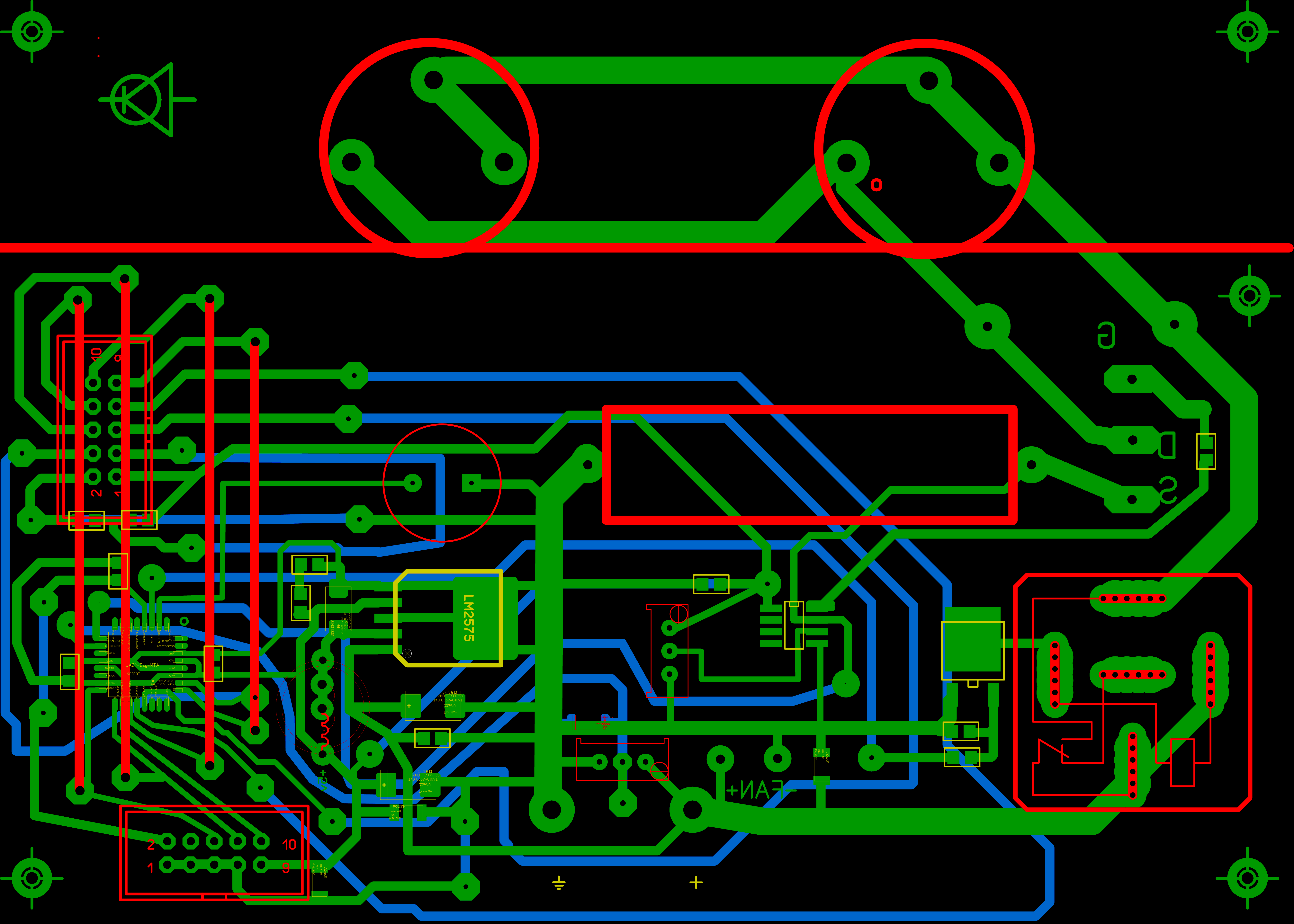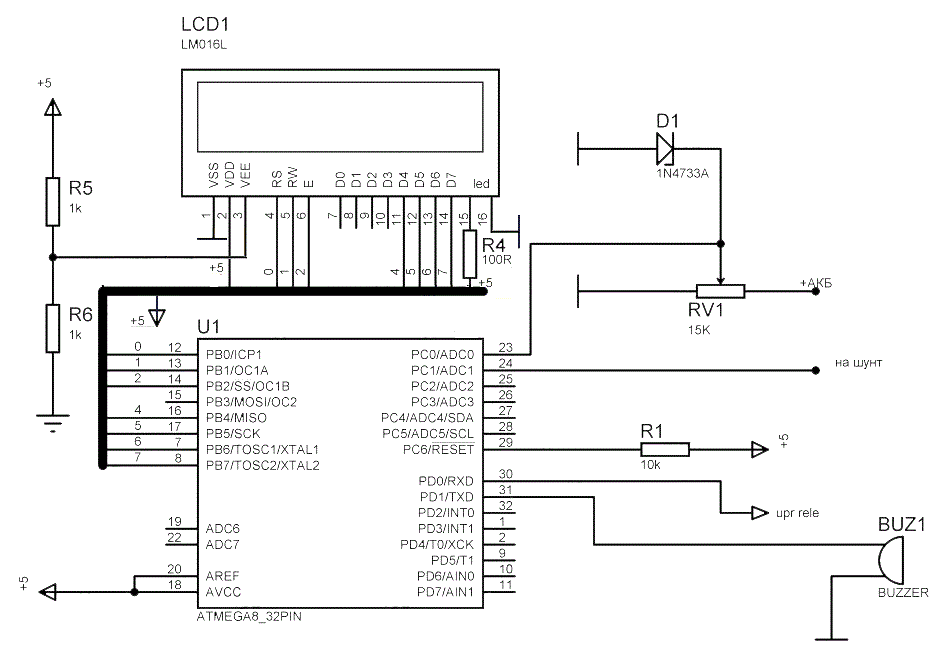 При подключении клемм на АКБ питание поступает на преобразователь, собранный на микросхеме LM2575-5 и питает микроконтроллер ATmega8A.