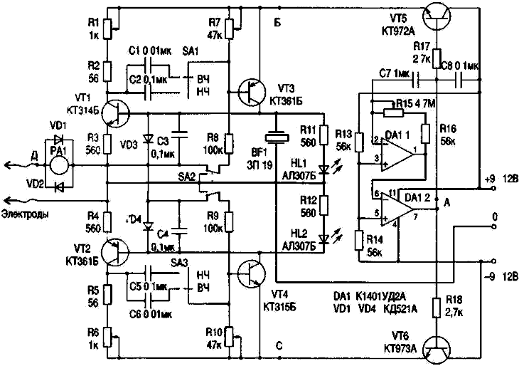 Если правильно установить порог чувствительности RC-генераторов (резистора ми R7 и R10) они начинают работать только тогда когда активный электрод касается биологически активной точки (БАТ), электрическое сопротивление которой обычно значительно меньше, чем у других точек тела. Частота стимулирующих импульсов положительной полярности регулируется резистором R1, отрицательной полярности - резистором R6. Частоту импульсов питания (амплитудной модуляции) регулируют резистором R15. Переключателями SA1 и SA3 выбирают диапазоны частот стимулирующих импульсов (ВЧ или НЧ). Световая индикация работы RC-генераторов обеспечивается цепью R11, HL1 и R12, HL2 соответственно Для звуковой сигнализации предназначен пье-зоэлемент BF1. Схема устройства при правильной сборке и исправных элементах в наладке не нуждается, однако во время работы тре буется регулировка порога чувствительности. Переключателем SA2 электростимулятор можно включить в режим постоянной генерации импульсов, и в таком режиме его можно использовать для терапии импульсами инфракрасного излучения, если параллельно цепям R11, HL1 и R12, HL2 подключить инфракрасные излучатели, например такие, как в [4]. Кроме того, электростимулятор можно дополнить стрелочным индикатором тока электростимуляции (предпочтительно со шкалой 100-0-100 мкА), и в этом случае его можно использовать для диагностики по методу Фолля [5], если период импульсов питания (амплитудной модуляции) установить 5 с и более. Более того, предполагаю, что любая БАТ может иметь асимметрию показаний стрелочного индикатора относительно нуля при чередовании положительных и отрицательных пачек импульсов, особенно заметной при наличии какой-либо патологии.