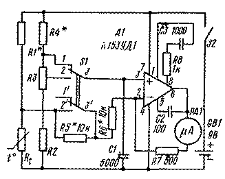 На первом из них измеряется температура в диапазоне +20...44╟С, а на втором контролируется отклонение температуры от предварительно установленного значения в диапазоне -2╟С. Термочувствительным элементом служит термистор Rt, включенный в одно из плеч моста, образованного резисторами R1, R2, R3 и R4. Напряжение разбаланса моста усиливается операционным усилителем А1 типа К153УД1, в цепь обратной связи которого включен микроамперметр с током полного отклонения 0,1 мА. Мост можно сбалансировать резисторами R1 и R4 при температуре 20╟С на первом поддиапазоне. На втором поддиапазоне резистор R5 замыкается накоротко и чувствительность прибора возрастает в 10 раз. В этом случае полному отклонению стрелки прибора соответствует изменение температур на 4╟С.
