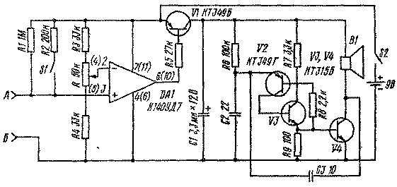 Схема содержит компаратор, реализованный на операционном усилителе (ОУ) К140УД7, электронный ключ на транзисторе V1 типа КТ349Б и звуковой генератор на транзисторах V2 типа КТ349Б V3 и У4 типа К.Т315В. Электрокожное сопротивление измеряется между точками А и Б. Связанный с точкой А пассивный электрод представляет полый алюминиевый цилиндр диаметром 20 мм и длиной 85 мм. Активный щуп, связанный электрически с точкой Б, оформлен как ручка с металлическим заостренным наконечником. При работе с прибором пассивный электрод держат в руке, а активным ищут соответствующую точку. Кожное сопротивление и резистор R1 образуют делитель напряжения, с которым соединен неинвертирующий вход операционного усилителя. К инвертирующему входу подается опорное напряжение с делителя напряжения на резисторах R3, R4 и потенциометра R. Если напряжение в точке А становится больше, чем на инвертирующем входе, то выходным напряжением операционного усилителя (около 9 В) транзистор VI запирается. Когда напряжение в точке А ниже, чем напряжение на инвертирующем входе, то транзистор VI открывается и подается напряжение питания на звуковой генератор, выполненный на транзисторах V2-V4.