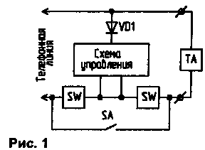 Функциональная схема устройства приведена на рис.1. В исходном состоянии ключи SW открыты. ТА подключен через них к линии и может принимать вызывной сигнал и осуществлять набор номера. Если после снятия трубки первая набранная цифра окажется индексом выхода на междугородную связь, в схеме управления срабатывает ждущий мультивибратор, который закрывает ключи и разрывает шлейф, производя таким образом отбой АТС. Индекс выхода на межгород может быть любым. В данной схеме задана цифра "8". Время отключения аппарата от линии можно установить от долей секунды до 1,5 мин.