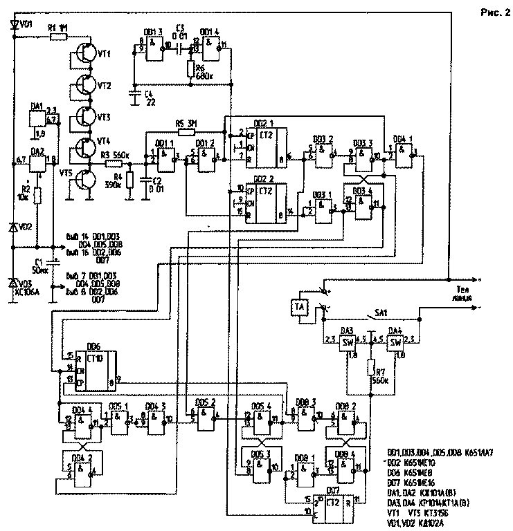 Данное устройство предназначено для запрещения междугородной связи с телефонного аппарата, который через него подключен к линии. Устройство собрано на ИМС серии К561 и питается от телефонной линии. Потребляемый ток - 100 150 мкА. При его подключении к линии необходимо соблюдать полярность. Устройство работает с АТС, имеющими напряжение на линии 48 60В. Некоторая сложность схемы вызвана тем, что алгоритм работы устройства реализован аппаратно, в отличие от аналогичных устройств [1], где алгоритм реализуется программно с использованием однокристальных ЭВМ или микропроцессоров, что не всегда доступно радиолюбителю.
