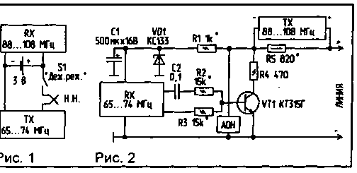 Порядок доработки приемника стационарного аппарата. Для управления транзистором VT1 (рис.2) с приемника используются два сигнала: напряжение точной настройки — для набора номера в линию, и напряжение низкой частоты — для модуляции. Если размеры радиотелефона в большой степени определяется мощностью передатчика радиотелефонной трубки, а та, в свою очередь, зависит от напряжения питания. Если не требуется большая дальность, для передатчика можно использовать питание приемника (рис. 1). Выбор источника напряжения и его величины определяется размерами радиотелефонной трубки
