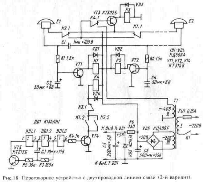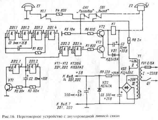 лефонного аппарата E1 и резистор R1 подается на базу транзистора VT1. Реле К1 срабатывает и контактами К1.2 замкнет цепь питания реле К4, а контактами К 1.1 замкнет линию подачи вызывного тока на аппарат Е2. Реле К4, управляемое импульсами генератора на логических элементах DD1.1 и DD1.2, будет периодически срабатывать с частотой 0,2...0,25 Гц, а его контакты К4.1 станут подавать на аппарат Е2 вызывное переменное напряжение, в результате чего и в этом аппарате будет звонить звонок. При снятии телефонной трубки аппарата Е2 на базу транзистора VT3 поступает открывающее его отрицательное напряжение, срабатывает реле КЗ и контактами КЗ.1 обесточивает реле К4. Одновременно срабатывает реле К2 и контактами К2.1 подключает линию аппарата Е1 к линии аппарата К2. Можно вести разговор. В течение разговора реле К1—КЗ находятся под током, а после возвращения трубок обоих телефонных аппаратов на рычаги устанавливаются в исходное состояние.