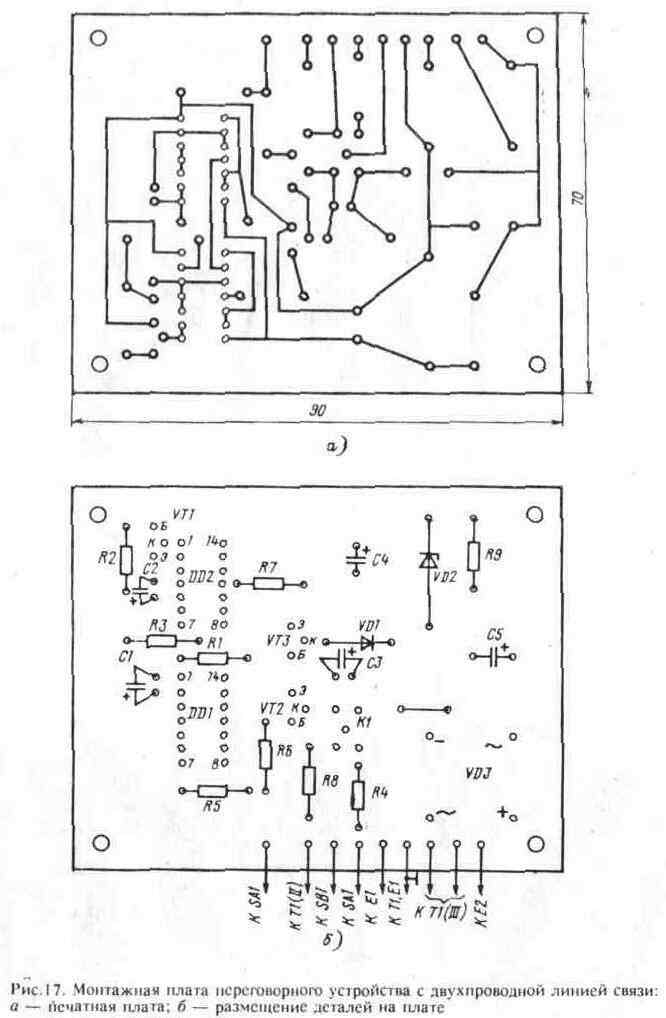 Большая часть элементов переговорного устройства смонтирована на печатной плате из одностороннего фольгированного стеклотекстолита толщиной 1,5...2 мм (рис. 17). Установочные отверстия элементов рассчитаны под оксидные конденсаторы К50-6 или K.50-16, реле РЭС15; типы остальных элементов указаны на принципиальной схеме.