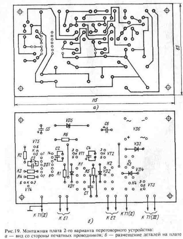 Все детали переговорного устройства, за исключением трансформатора Т1, предохранителя FU1 и выключателя питания Q1, размещены на печатной плате (рис. 19). Использованы реле типов РЭС15 (КЗ, К4), РЭС48 (К1, К2), конденсатор С 1 — К73-17.
