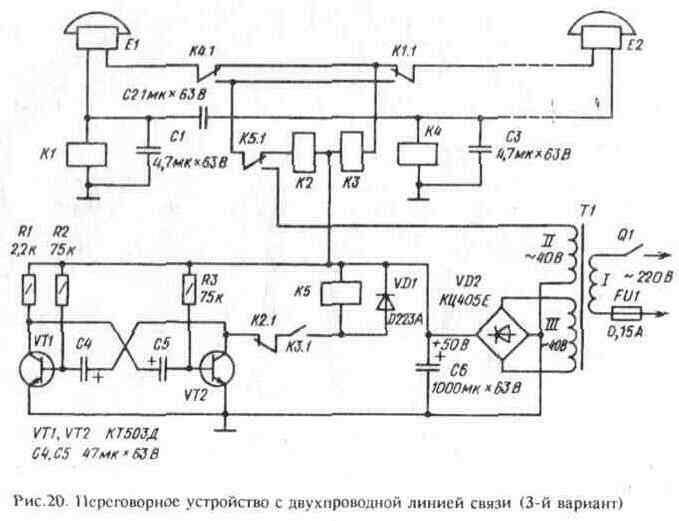 На рис. 20 представлена схема еще одного, третьего, варианта переговорного устройства с двухпроводной линией связи. Это устройство работает следующим образом.