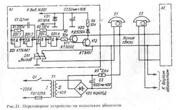 На рис. 21 представлена схема еще одного варианта переговорного устройства. Отличие его от предыдущего состоит в том, что допускается подключение к линии нескольких телефонных аппаратов. Кроме того, для питания аппаратов используется только одно напряжение, получаемое от трансформатора.