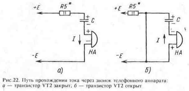 Рассмотрим, каким образом импульсное однополярное напряжение заставляет звучать звонок. Путь прохождения тока через звонок телефонного аппарата показан на рис. 22. Когда транзистор VT2 находится в закрытом состоянии, он не воздействует на линию связи, и через резистор R5 и конденсатор С телефонного аппарата от источника напряжения Е протекает зарядный ток в направлении, показанном на рис. 22,а. При этом молоточек звонка НА отклоняется в одну сторону, ударяя по чашке. Открывание транзистора VT2 вызывает замыкание линии связи через небольшое (сотни ом) сопротивление открытого транзистора (на рис. 22,б оно не показано). Конденсатор С разряжается на обмотку звонка НА. Направление тока, как видно из рисунка, противоположно показанному на предыдущем рисунке. Таким образом, через катушку звонка протекает переменный ток, приводя в движение молоточек звонка.