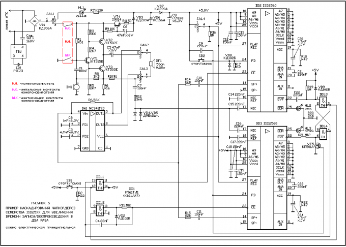 При таком решении все три чипкордера активированы одновременно, поэтому потребляемый ток от источника питания может достигать более I=60mA. Никакая телефонная линия такой ток отдать не сможет, следовательно, надо применить схему каскадирования, в которой в данный момент времени активирована только одна микросхема. Это реализовано в предлагаемой экспериментальной схеме диктофона с увеличенным временем записи/воспроизведения телефонных разговоров. Принципиальная схема показана на РИСУНКЕ 5: