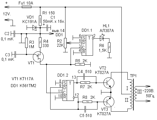 адающий генератор преобразователя собран на однопереходном транзисторе VT1, резисторах R3—R5 и конденсаторе СЗ. Частоту генерируемых им импульсов, равную 100 Гц, D-триггер DD1.2 делит на 2. При этом на выходах триггера формируются взаимно инверсные импульсы, следующие с частотой 50 Гц. Они управляют ключевыми транзисторами VT2 и VT3 , включенными по схеме двухтактного усилителя мощности. Нагрузкой транзисторов этого каскада служит трансформатор Т1, повышающий импульсное напряжение стабилизатора до 220В.
