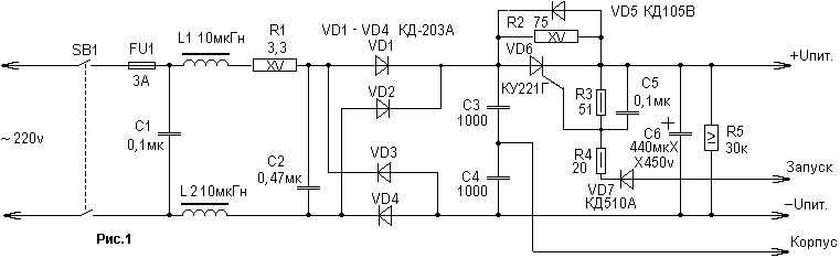 В начальный момент времени тринистор VD6 закрыт, ток зарядки конденсатора С6 ограничивается резистором R2 и преобразователь запускается при пониженном напряжении. После этого с обмотки IV трансформатора Т3 (см. рис.2) на диод VD7 (см.рис.1) поступает управляющее напряжение, которое открывает тринистор. Он шунтирует резистор R2, и преобразователь выходит на номинальный режим работы. Диод VD5 защищает тринистор VD6. Цепь R1,C2, ограничивающая скорость нарастания напряжения на аноде тринистора VD6, исключает его самопроизвольное включение. Элементы L1,L2,C3,C4 образуют фильтр, который подавляет импульсные помехи,создаваемые генератором блока питания.