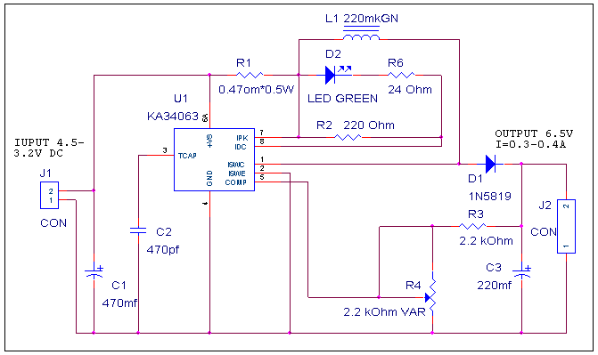 Устройство представляет собой малогабаритный экономичный преобразователь DC-to-DC с повышением напряжения. Основная область применения таких устройств - это цепи питания различных электронных устройств, устройства заряда сотовых телефонов от стандартных элементов типа АА или ААА, когда габариты устройства или другие технические причины не позволяют собрать батарею элеметов на нужное напряжение. Ток во вторичной цепи может быть до 300-400 mA . Коффициэнт полезного действия устройства находится в пределах 80%, что является хорошим показателем для подобных устройств. Следует обратить внимание, что коффициэнт полезного действия устройства увеличивается с уменьшением разницы между входным и выходным напряжением.