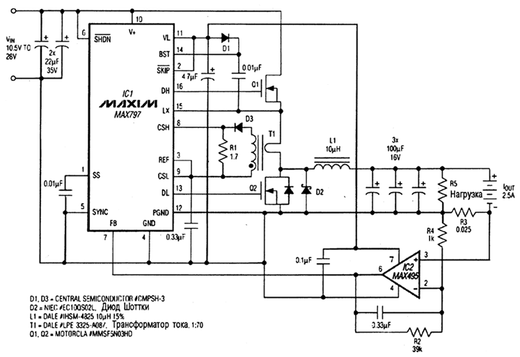 Микросхема IC1 представляет собой импульсный стабилизированный понижающий преобразователь, который работает и с внешним мощным электронным ключом на транзисторе Q1, и с синхронным выпрямителем. В схеме применена цепь вольтодобавки для получения источника плавающего положительного напряжения, который необходим для управления затвором транзистора Q1. При протекании тока заряда на резисторе R3 сопротивлением 25 мОм появляется напряжение, которое усиливается операционным усилителем, а его выходной сигнал положительной полярности подается на соответствующий вход IC1 в качестве напряжения обратной связи. При такой обратной связи микросхема стабилизирует ток заряда на уровне 2,5 А.