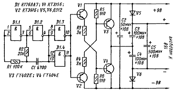 Схема бестрансформаторного преобразователя напряжения, предложенная Г. Кузнецовым, показана на рисунке. На цифровой микросхеме D1 собран экономичный задающий генератор прямоугольных импульсов частотой 10 кГц и амплитудой, практически равной напряжению питания (9 В). В течение одного полупериода транзисторы VI и V4 открыты, a V2 и V3 закрыты, конденсатор СЗ заряжается через насыщенный, транзистор V4 и диод V5 до напряжения, почти равного напряжению питания, В течение другого полупериода аналогично заряжается конденсатор С4 (через транзистор V3 и диод V6). На конденсаторе С5 происходит сложение этих напряжений, поэтому напряжение на выходе преобразователя приближается к удвоенному напряжению питания. Под нагрузкой при токе 120 мА напряжение падает до 16 В. При этом коэффициент пульсаций составляет 20 мВ, КПД около 85 %, а выходное сопротивление около 10 Ом. Детали. Транзисторы типов KT3I5 (VI) и КТ361 (V2) с h21э> 50; диоды Д312, Д310, Д311 или типа Д7. Микросхема К176ЛА7 или К176ЛЕ5.