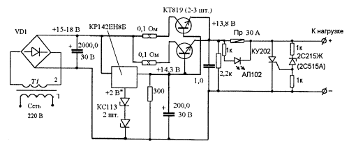 Подключенный на выходе тиристор надежно сжигает предохранитель если выходное напряжение по каким-то причинам становится выше допустимого, величина напряжения срабатывания защиты зависит от стабилитрона.