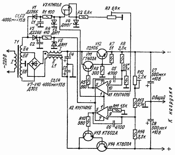 Блок питания состоит из одного общего выпрямителя (V7- У10) и двух взаимно зависимых компенсационных стабилизаторов, выполненных по последовательной схеме (V11, V12, А1 и V13, V14, A2).