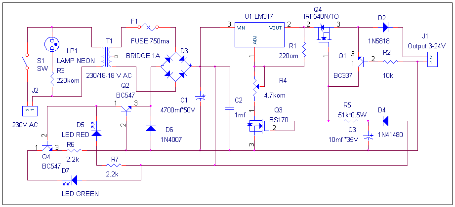 Величину требуемого напряжения заряда устанавливают подбором подстроечного резистора R4. Желательно, чтобы величина максимального тока не превышала 600 mA. Если величина тока заряда не превышает 200 mA, нет необходимости в установке стабилизатора U1 на радиатор. Светодиод D5 сигнализирует о наличии тока заряда, светодиод D7 о заряде батареи и переходе зарядного устройства в режим поддержания минимального тока заряда - исключающего саморязряд батареи. Желательно после перехода блока в этот режим оставить батарею в заряде ещё в течении пару часов - для гарантии получения полностью заряженной батареи. Устройство защиты от переполюсовки собрано на транзисторах Q3, Q4. ИНдикация заряда на транзисторах Q2, Q4. Трансформатор должен быть не менее 15- 20 W, выходное напряжение не менее, чем на 15-20% больше, чем расчётное напряжение заряда. При существующих номиналах, в схеме применён трансформатор на 30 Вольт. Как вариант рекомендуется установить на передней панели устройства приборы: амперметр и вольтметр, сопротивление R4 поставить в этом случае переменного типа и вывести также на переднюю панель устройства. Получится универсальное зарядное компактное устройство. Предложенную схему защиты от переполюсовки можно применить в любой другой схеме источника заряда или блока питания, в том числе и в предложенном на нашем сайте импульсном источнике заряда.